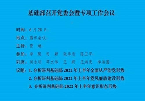 为进一步贯彻落实全面从严治党要求,深入推进基础部党风廉政建设工作,分析研判疫情期间意识形态领域情况和问题。6月28日下午,基础部召开党委会暨专项工作会议,分别对基础部2022年上半年全面从严治党、党风廉政建设和意识形态情况进行了分析研判。基础部党委委员、党支部书记参加会议。