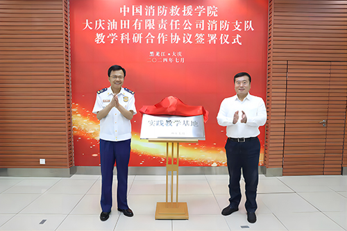7月3日,中国消防救援学院与大庆油田有限责任公司消防支队教学科研合作协议签约仪式在大庆油田消防支队机关举行。学院院长闫胜利,大庆油田有限责任公司(大庆石油管理局有限公司)副总经理、安全总监张波,大庆油田消防支队支队长孙伟等领导出席,学院和大庆油田消防支队相关负责同志参加了仪式。仪式由大庆油田消防支队党委书记、政治委员杨永华主持。合作协议签订后,双方领导共同为“实践教学基地”揭牌。
