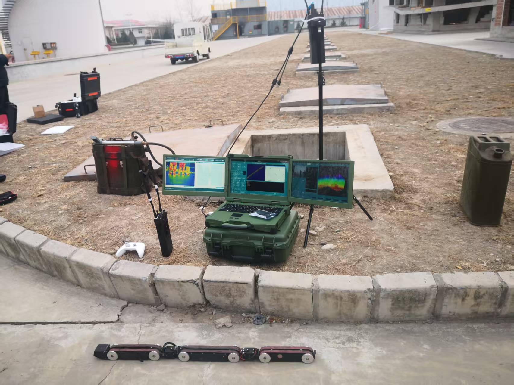测试过程中,在模拟坍塌建筑的复杂通道场景中,机器人借助辅具在具有二次坍塌风险的建筑物内部穿行,并通过红外热成像、激光雷达与视觉传感融合技术精准识别被困人员位置,实时回传清晰图像;在垂直深井模拟环境中,机器人利用项目团队自主研发的通信模块终端,在信号衰减严重地段投放自适应中继节点,确保通信链路稳定,成功实现深井底部音视频信息与激光点云数据的连续回传;在受限空间模拟场景测试中,机器人凭借多关节柔性结构、主动越障机构与多自由度运动底盘,顺利通过狭窄通道、瓦砾缝隙,完成狭小通道内上下攀爬与复杂障碍通行任务。
