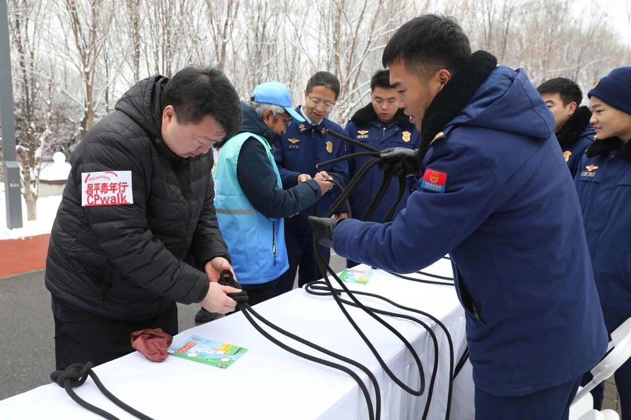 在昌平区温榆河・未来智谷,学院联合昌平团区委开展昌平青年CPwalk活动,以“志愿服务+城市徒步+文化体验+趣味闯关”的形式,打造集公益实践、安全科普、青年社交于一体的沉浸式志愿服务活动。在应急技能主题打卡点,志愿者们现场演示心肺复苏、基础逃生与救援绳结技能,通过“实操教学+互动体验”的方式,让市民快速掌握实用应急本领。